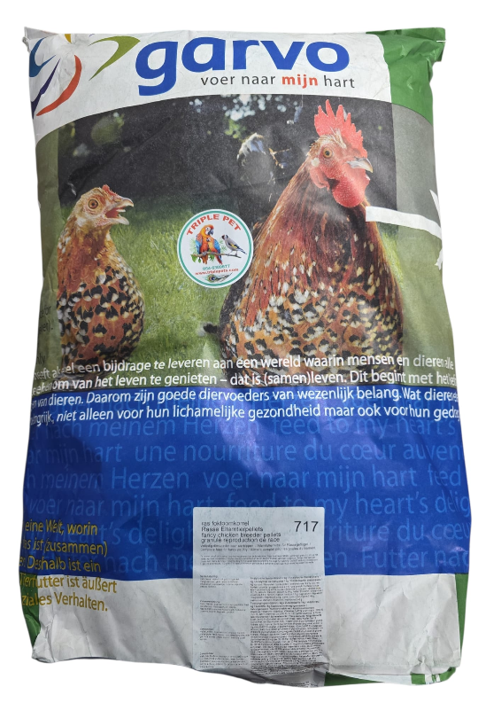 717 Fancy Chicken Breeder Pellet מבית Garvo היא תערובת מטילות פרמיום לתרנגולות המיועדת במיוחד לתרנגולות מטילות ועופות רבייה. מדובר בכופתיות איכותיות המספקות מזון מלא לתרנגולות מטילות עם חלבון, סידן וויטמינים חיוניים, המסייעים להטלה יציבה, ביצים חזקות ובריאות כללית מיטבית ןשיפור הפוריות.